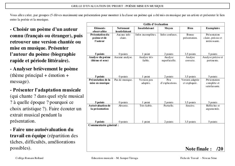 GRILLE D'ÉVALUATION ET CONSIGNES DU PROJET POÉSIE MISE EN MUSIQUE