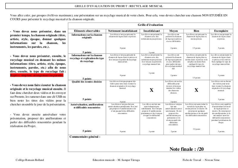Grille D'Évaluation Et Consignes Du Projet Recyclage Musical